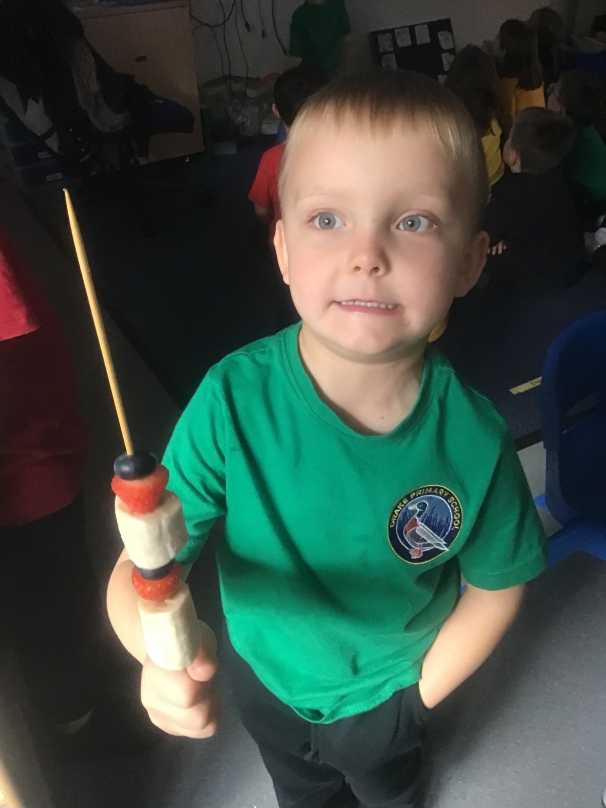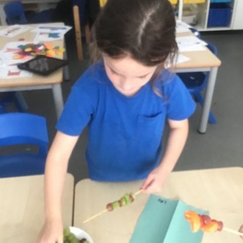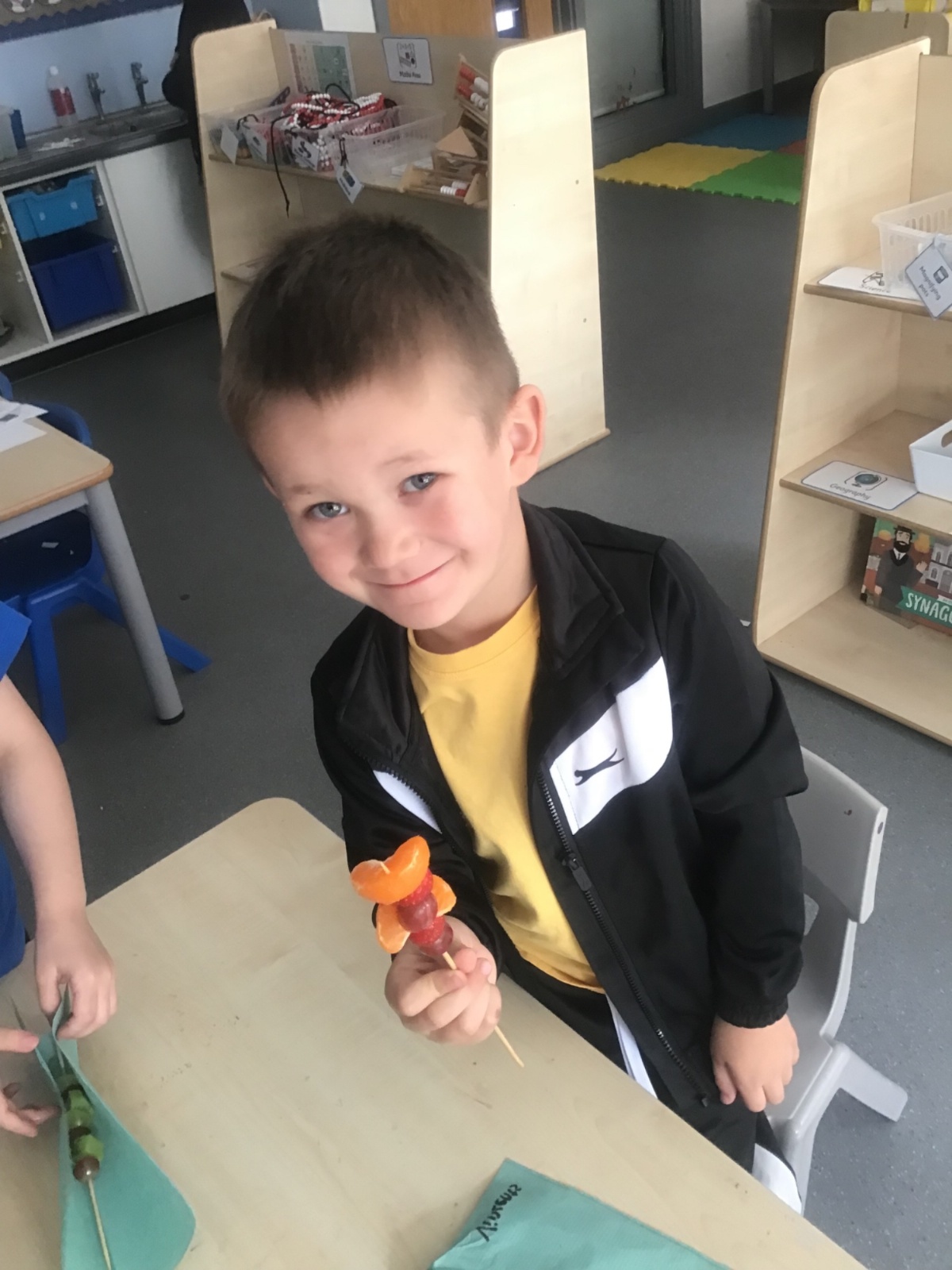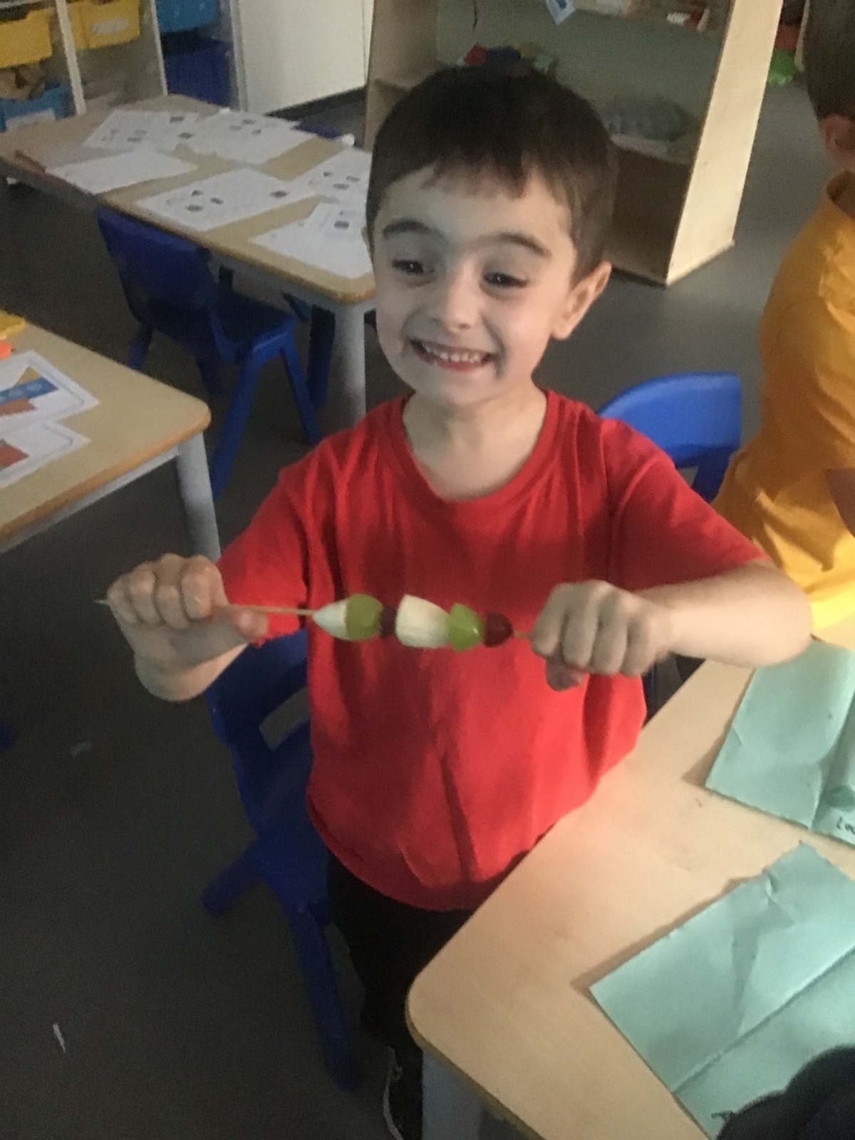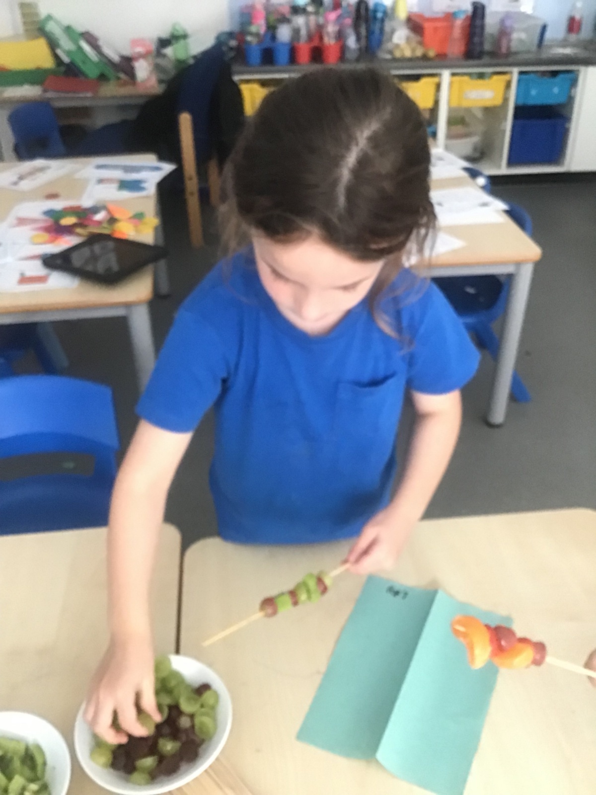 As part of our Maths topic on patterns the children enjoyed making fruit kebabs. The children impressed us with our knowledge of AB and ABC patterns and could identify the piece of fruit that they would need to use next on their kebab stick.