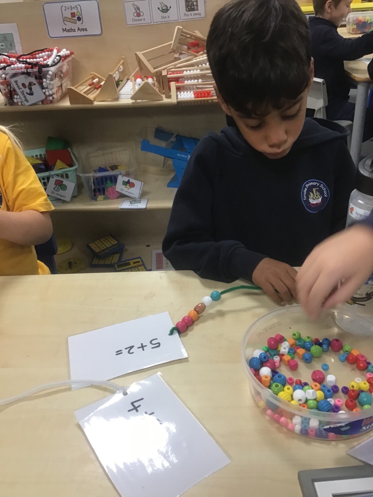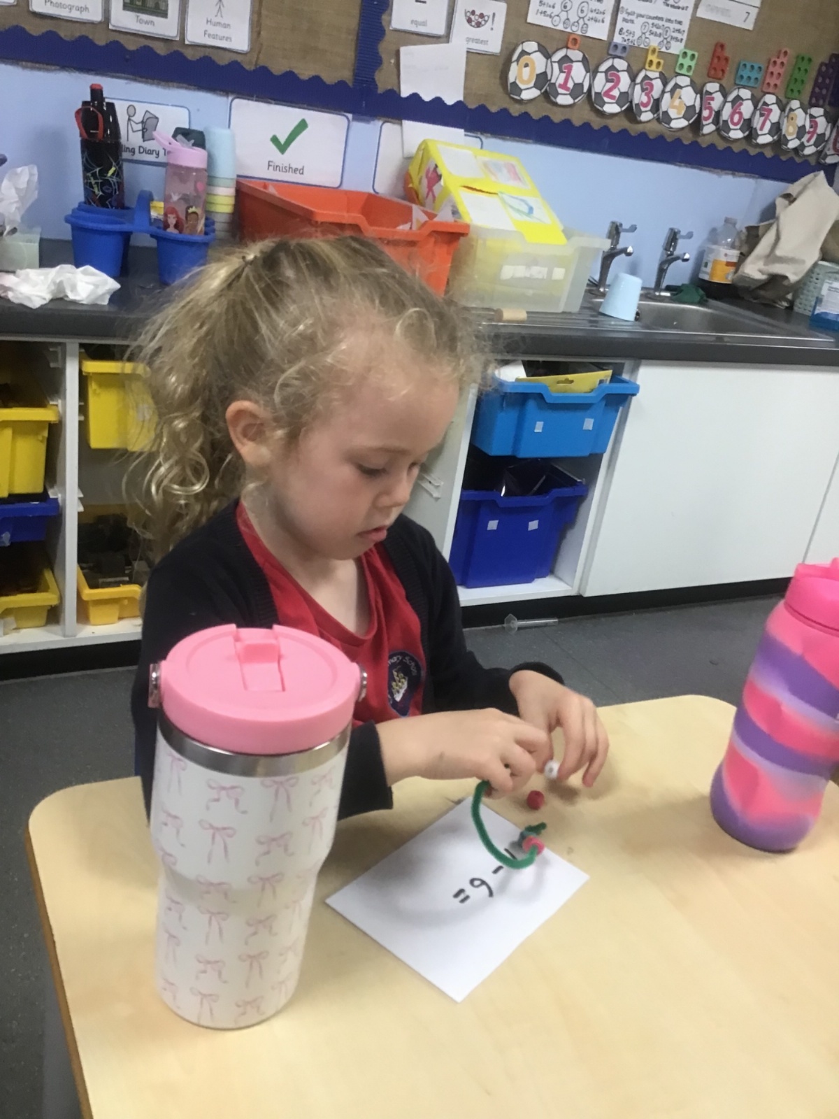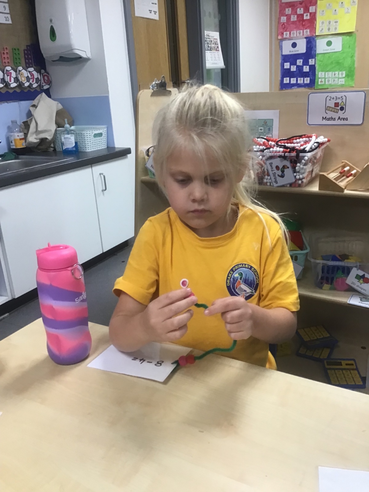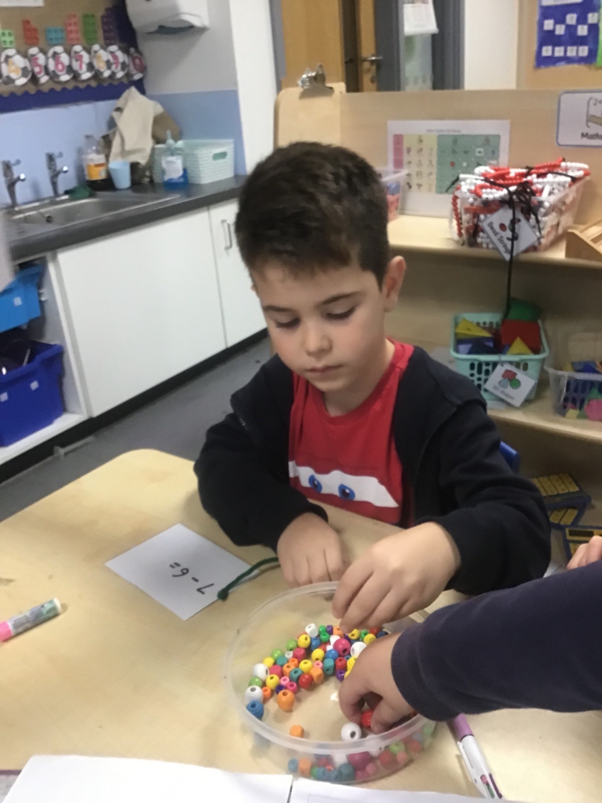 In our Maths, we have been learning about subtraction. The children then enjoyed applying their subtraction skills through making their own bead strings to solve the equations.