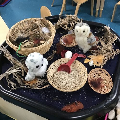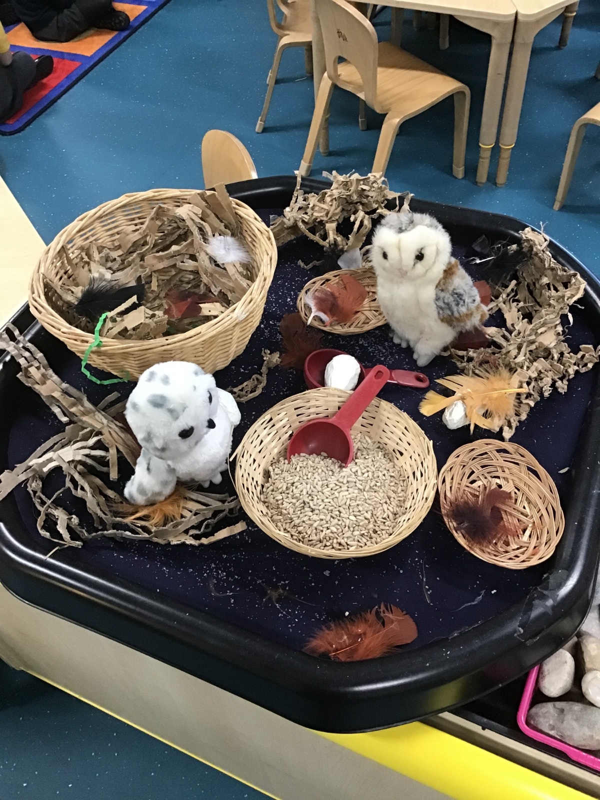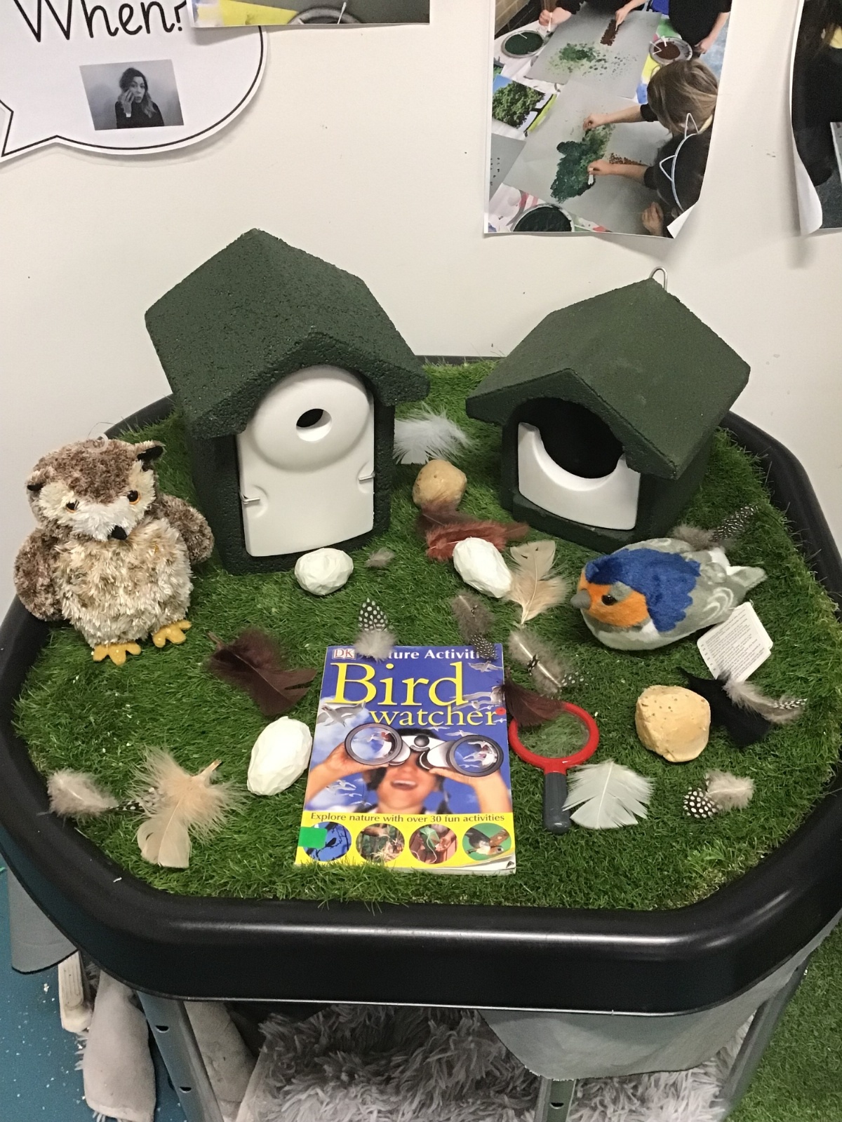 The children loved making and naming their own birds and hanging them around the classroom and in Forest School, as well as creating heart-shaped bird feeders to help make the birds feel loved and looked after. Our small world areas were transformed into bird-themed environments with books and seeds for the children to explore.