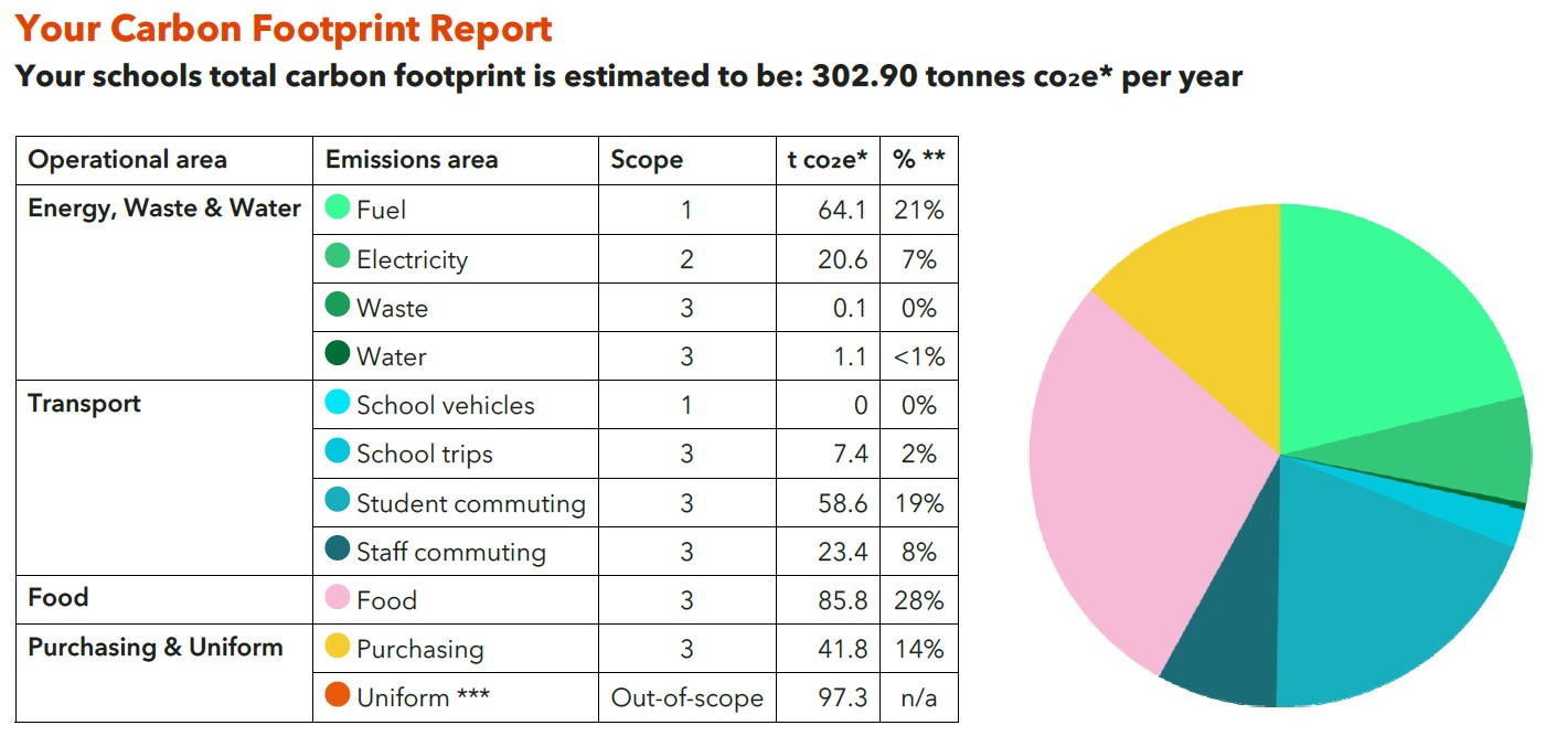 We looked at our energy and water use, waste, transport, food, and purchasing. We estimate that our school produced 302.90 tonnes of carbon dioxide equivalent (CO₂e) over the last academic year.