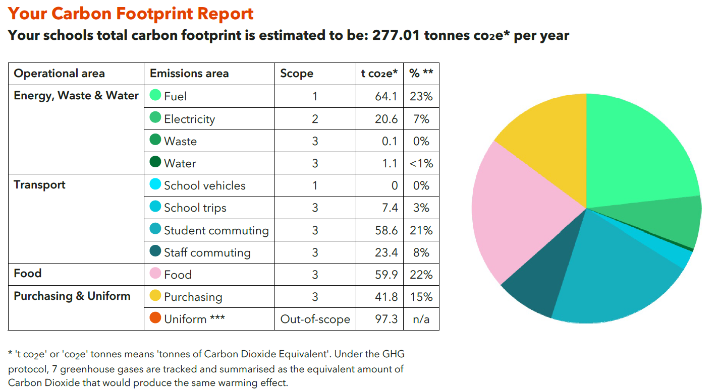 We looked at our energy and water use, waste, transport, food, and purchasing. We estimate that our school produced 277.01 tonnes of carbon dioxide equivalent (CO₂e) over the last academic year.