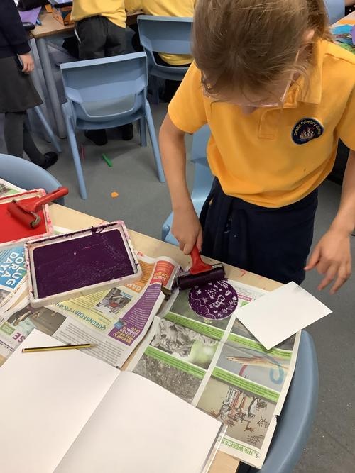 In art, we are creating a collage of the Thetford river bridge. We painted the background of our Thetford river bridge collage.
