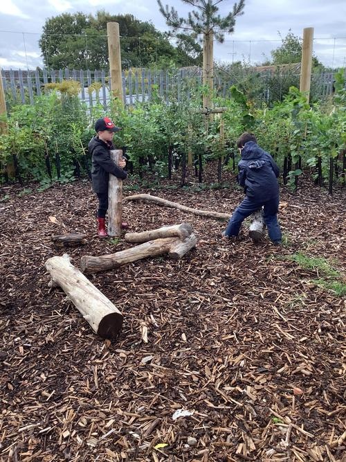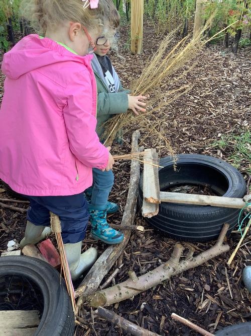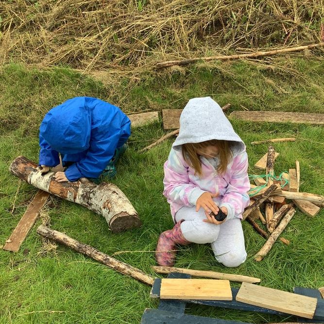 Forest School - Being Stone Age people, playing survival, sorting the story stones into what would be Stone Age objects, using charcoal to draw Stone Age pictures, and making bow and arrows with wool and sticks.