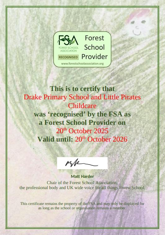 At Drake Primary, we are proud to provide Forest School sessions for children from Reception through to Year 6. These experiences enrich and extend the curriculum, offering children valuable opportunities to learn beyond the classroom.